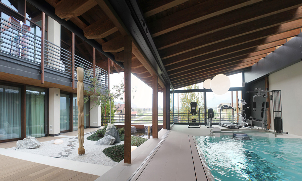 Siamo a Borgo San Dalmazzo, provincia di Cuneo, qui, un fabbricato anni 60 è stato trasformato in una lussuosa villa su 4 piani su progetto dell’Architetto Dario Castellino. Due le criticità del recupero: da una parte la dispersione termica di questa tipologia di struttura dall’altra i dimensionamenti strutturali non compatibili con le norme attuali a livello sismico. La casa è stata ristrutturata su quattro grandi muri paralleli tra loro, con un leggero tetto in legno e creando due fianchi chiusi contrapposti a due ampie aperture con vetrate. In questa trasformazione un ruolo importante è svolto dal legno, protagonista dal sotto tetto ai pavimenti. Il parquet scelto nella ristrutturazione è Teak anticato di Alma nello stesso colore della copertura, così da creare due piani visivi paralleli che incorniciassero lo spazio interno. Il legno è stato disposto perpendicolarmente ai muri, non sulla lunghezza ma sulla larghezza, così da poter dilatare gli spazi, mentre delle fasce bianche, in corrispondenza delle murature interne, sono state utilizzate per creare degli interessanti contrasti di colore.