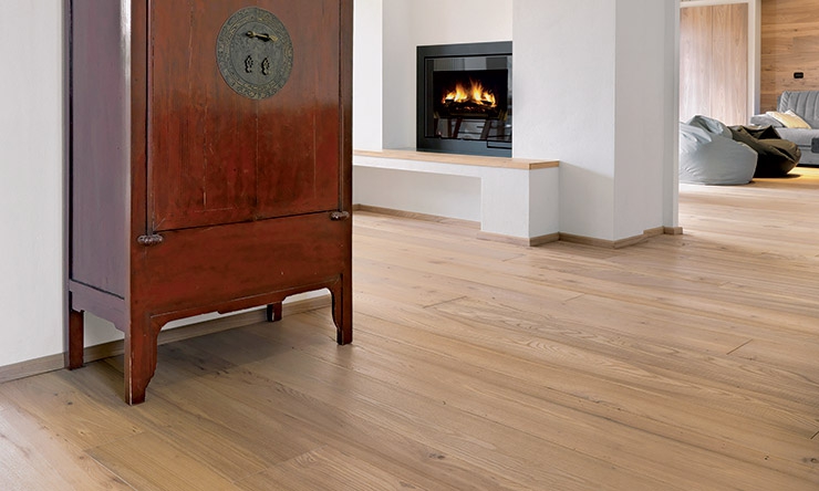 La scelta di applicare una finitura a olio naturale pone in evidenza le chiare sfumature autunnali, tipiche di questa specie legnosa, così come la rugosità della superficie. Il parquet Olmo de Casera fa parte della collezione Listoni d’Epoca, tavolato di tre strati di legno massiccio di grandi dimensioni: da 14 a 30 cm di larghezza per lunghezze fino a oltre i 3 metri, tutte ricavate dal taglio della stessa frisa.