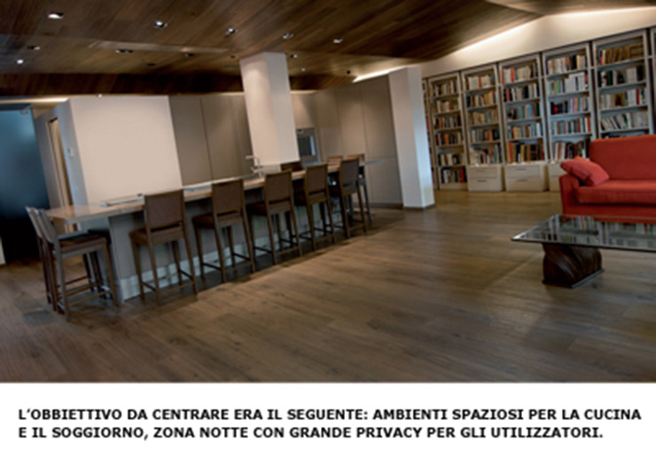 Per poter realizzare il progetto sono state azzerate tutte le suddivisioni interne ed è stato ridisegnato l’intero impianto distributivo, dedicando allo spazio “soggiorno – cucina – servizi” una zona a pianta libera, nella quale una grande isola attrezzata svolge un ruolo sia tecnico sia conviviale per 12 commensali. La ricerca di un elemento materico unificatore e modellatore dello spazio abitativo ha portato all’idea di utilizzare il tavolato di legno, opportunamente sagomato, per dare vita a un controsoffitto che, staccato dalle pareti, caratterizzasse fortemente l’ambiente, agganciato per materiale e colore al suo speculare pavimento, anch’esso realizzato con il medesimo tavolato.